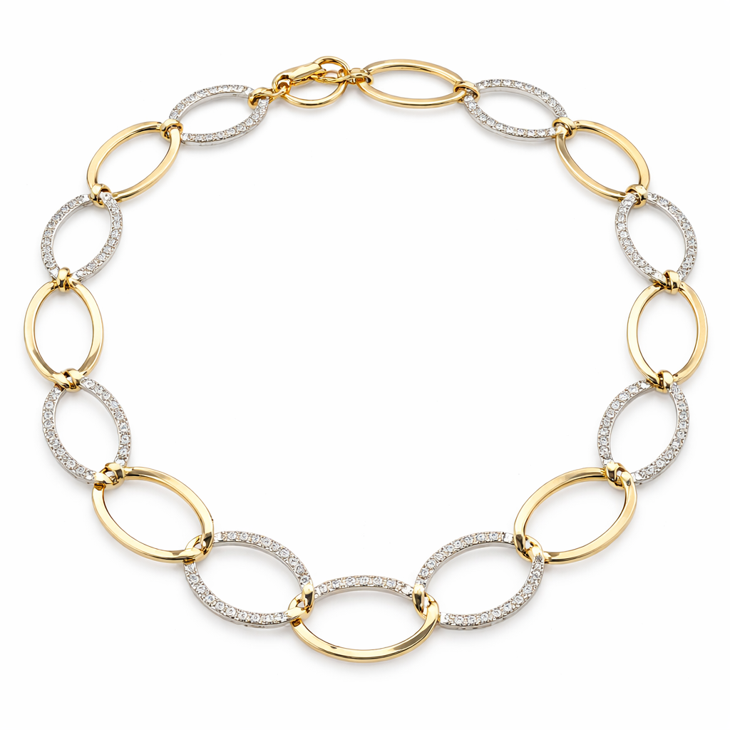 18kt white and yellow gold open oval diamond necklace. Elevate your style with this exquisite chain necklace crafted in radiant yellow gold. Round brilliant-cut diamonds embellish the links, adding a touch of sparkle and sophistication. A luxurious piece, perfect for adding glamour to any ensemble.