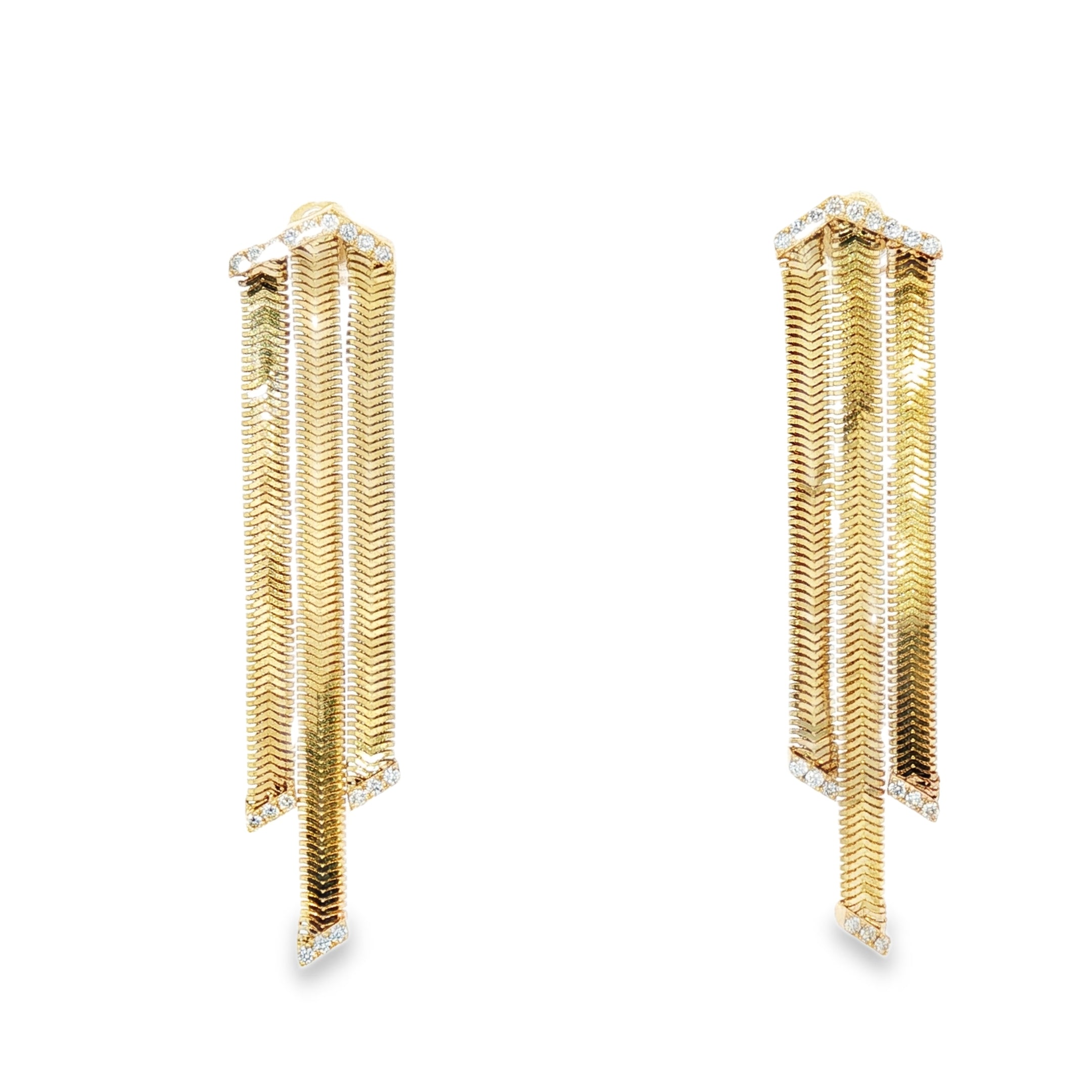 14kt yellow gold 3 herringbone chain diamond drop earrings. Elevate your ensemble with these herringbone chain dangle earrings, meticulously crafted from lustrous yellow gold. Showcasing a cascade of meticulously arranged round brilliant cut diamonds, these earrings embody modern elegance. Designed to gracefully suspend and catch the light, these earrings are a sophisticated addition to any jewelry collection.
