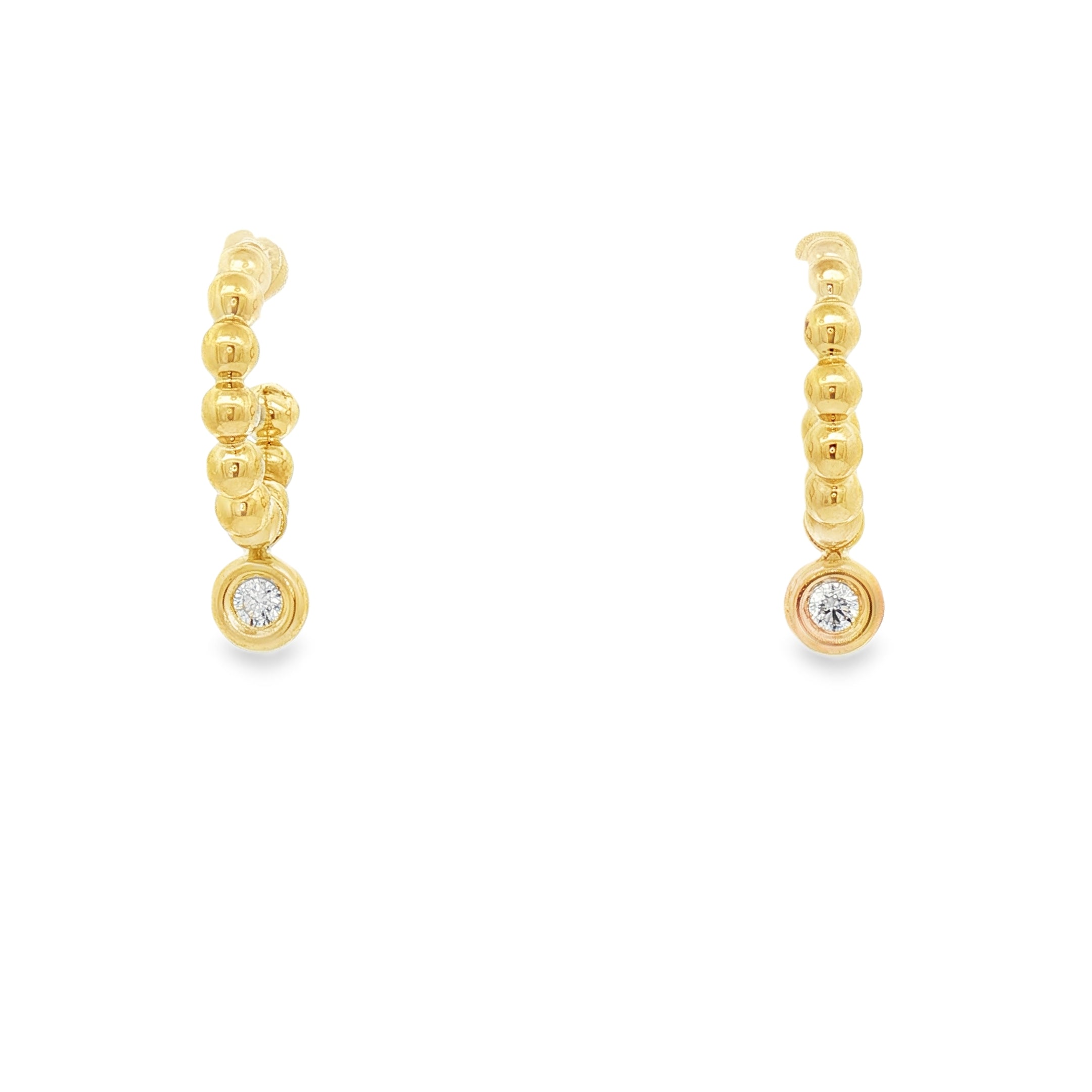 14kt yellow gold beaded hoops with dangling diamond bezel earrings. Elevate your everyday style with these charming yellow gold hoop earrings. A string of delicate golden beads leads to a sparkling round brilliant cut diamond, adding a touch of understated glamour. The clean lines and graceful design make these earrings a versatile addition to any jewelry collection.