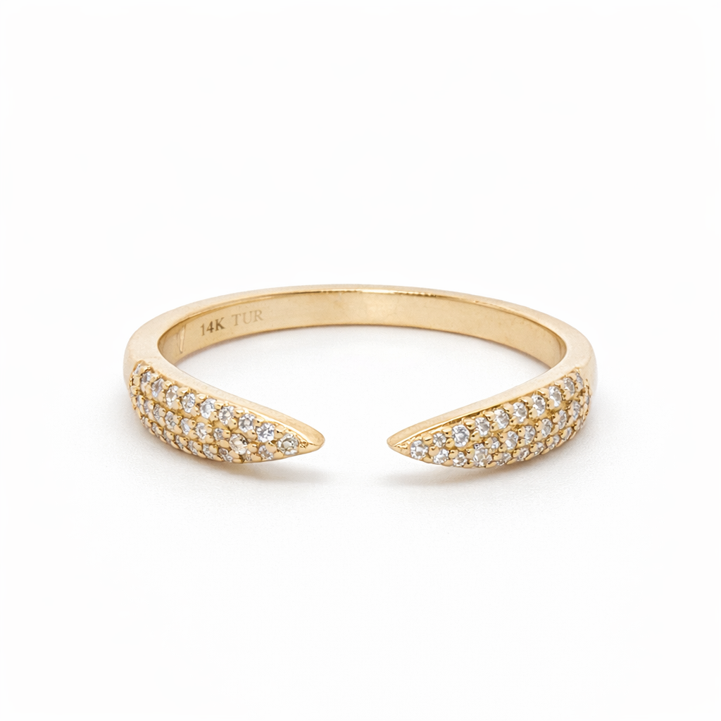 14kt yellow gold split pointed pave diamond ring. Exquisite open-shank band ring, expertly crafted in lustrous yellow gold. The band is adorned with a dazzling array of round cut diamonds, set in a brilliant style. This ring radiates sophistication and modern elegance, perfect for adding a touch of sparkle to any ensemble.